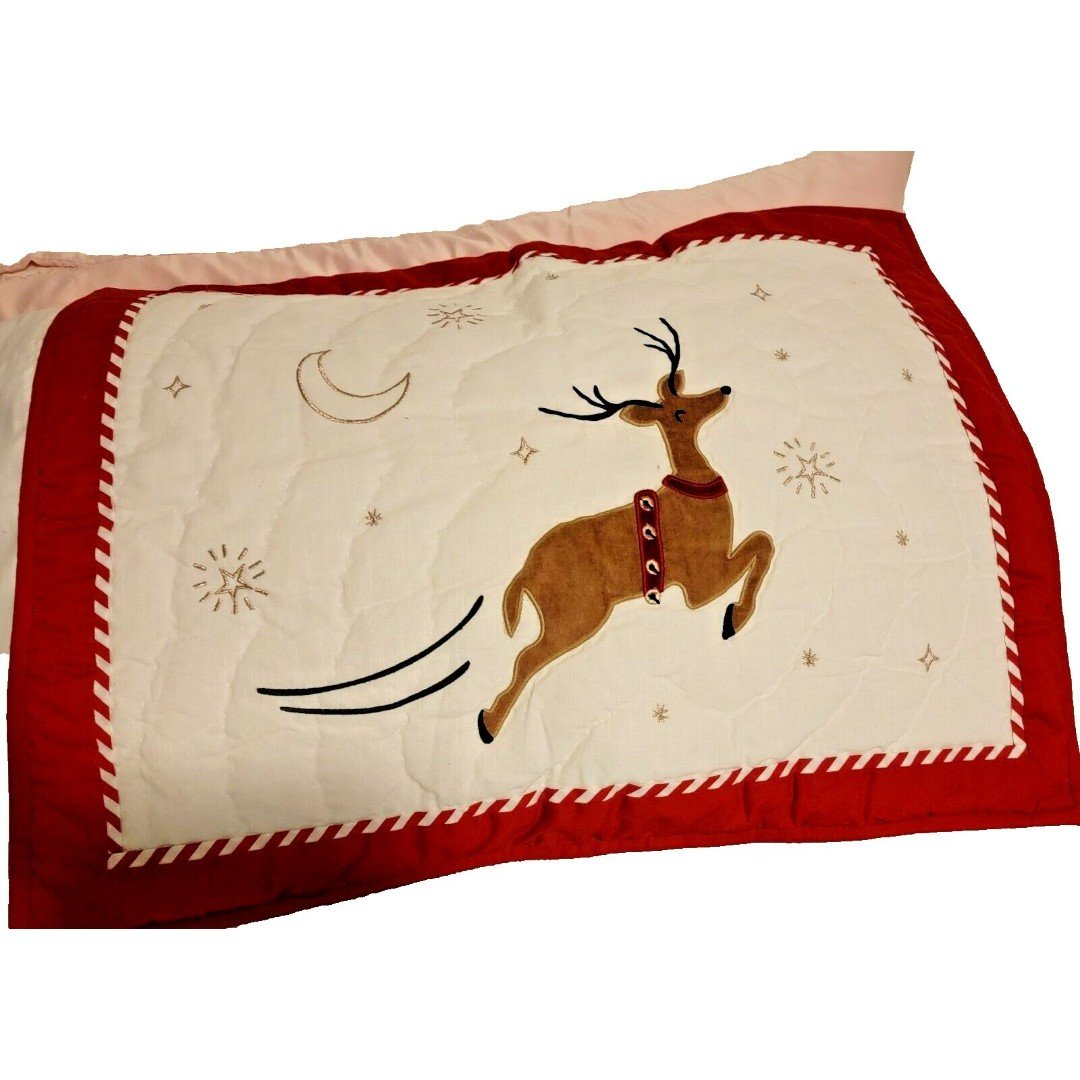 Add a festive touch to your child's bedroom with this Pottery Barn Kids Christmas Standard Pillow Sham. Featuring a red striped design with a reindeer this pillow sham is perfect for the holiday season. Measuring 26 inches in length and width, it fits standard size pillows and is made from high-quality materials for durable use. The set includes one pillow sham and is ideal for kids who love Christmas.