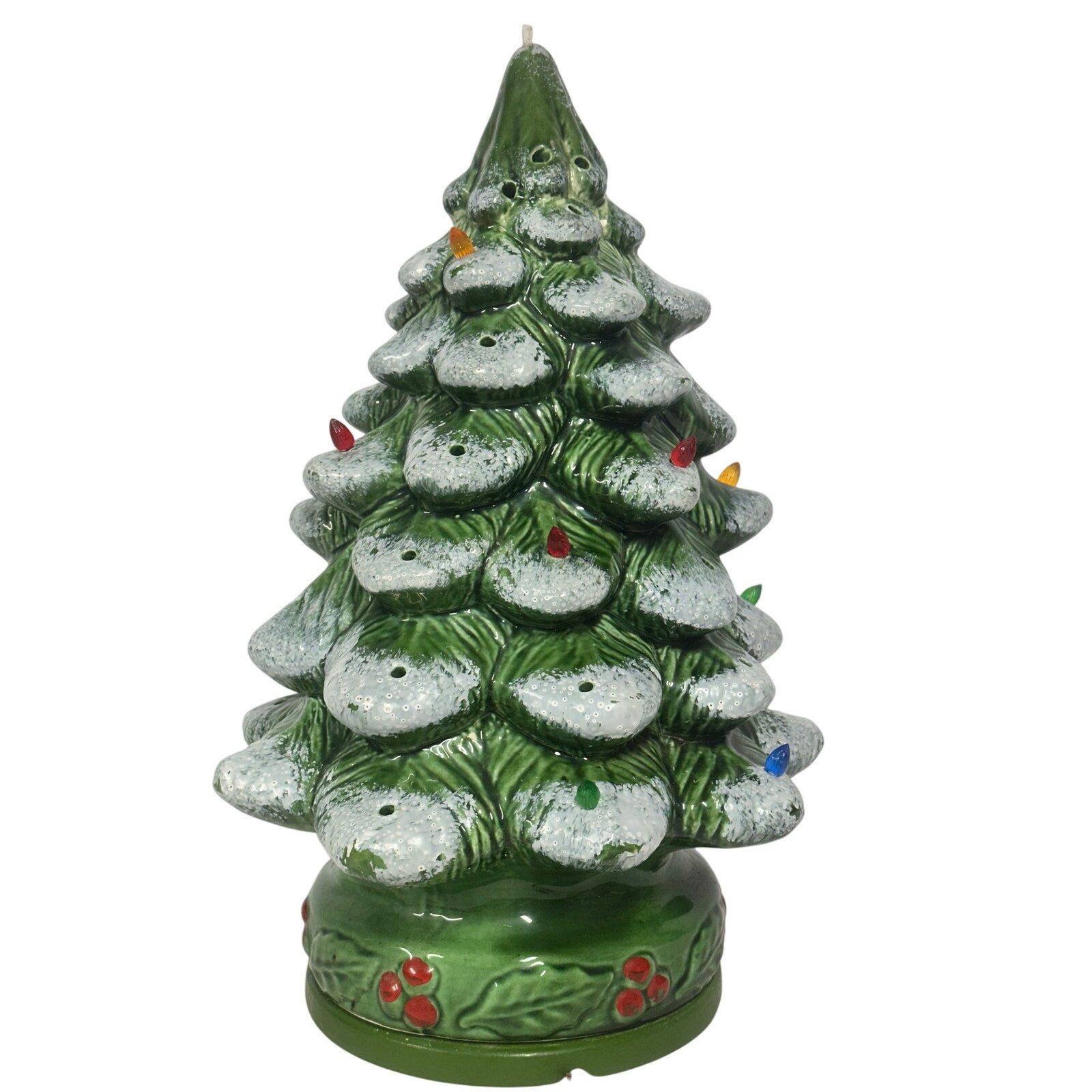 Add a touch of vintage charm to your holiday decor with this beautiful ceramic Christmas tree! This 17.5-inch tree features a classic design with multi-colored lights and comes with its original stand. Please note - this tree is in very good vintage condition but missing the top star and many of the lights. Please see photos to verify condition. Made in the USA, this vintage tree is sure to bring back nostalgic memories and add a festive glow to your home. Perfect for collectors or anyone who loves unique holiday decorations. Don't miss out on this opportunity to own a piece of Christmas history! 5053