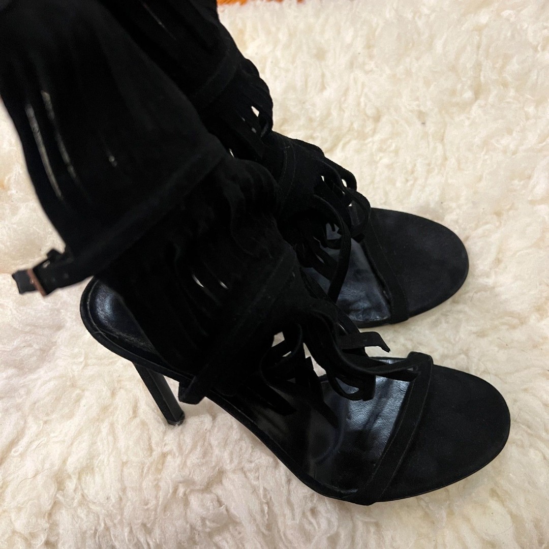 These gorgeous Gladiator Stiletto heeled sandals by Gucci are crafted from black suede. They standout from the rest with their unique fringe details at the fronts, creating a trendy design. They are coupled with double ankle straps with buckle fastenings and 11cm heels. The insoles are leather lined.