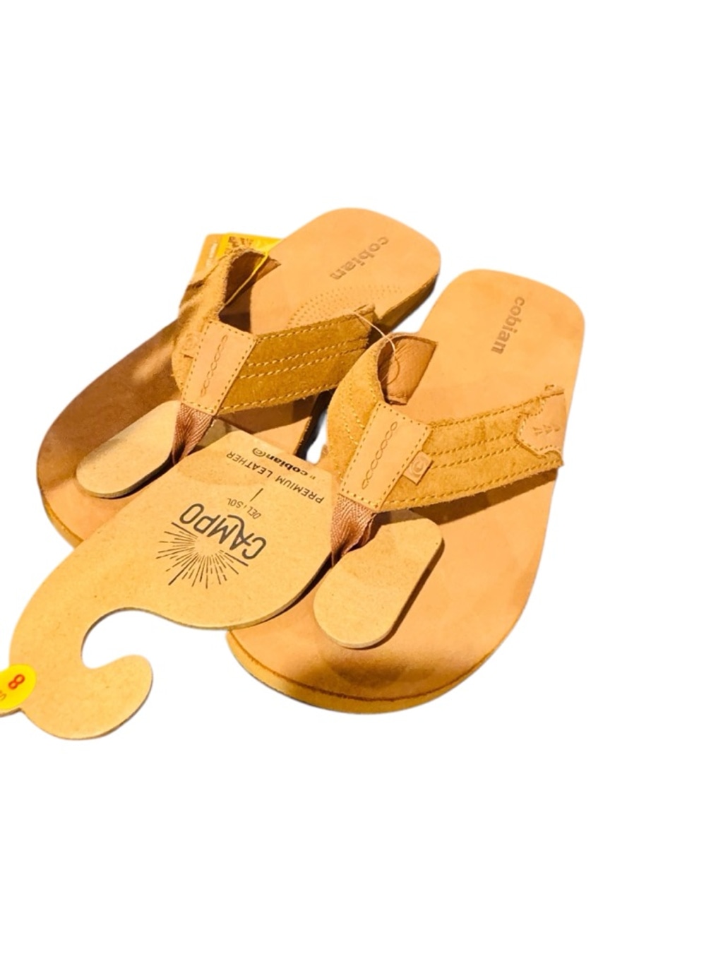 These are a pair of new with tags Cobian Lazo leather flip-flop sandals in a tan color, size 8. The sandals feature a smooth tan leather footbed with "cobian" embossed near the heel and a textured pattern under the ball of the foot. The straps are also tan leather, with a woven detail on the top strap. The outsoles are brown with a repeating circular pattern and "cobian" text. The original tags, including an MSRP of $64.99, are attached.