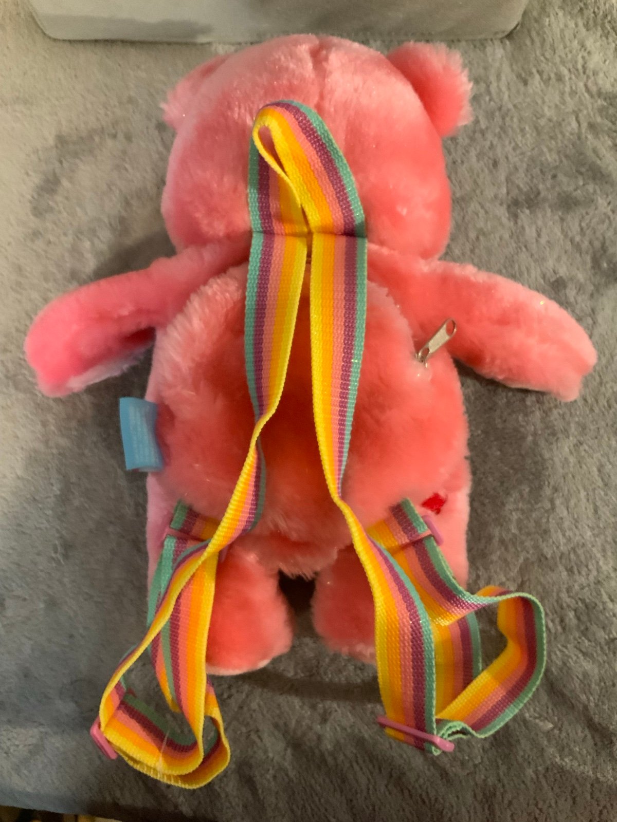 Like new condition Love-A-Lot rainbow shimmer plush backpack. About 13" tall and the zip pocket on the back is around 4" wide. The fur has sparkles in it- which is just the cutest! Front belly badge is shining holographic applique unlike the original styles of plush (and this style of Love-A-Lot backpack tends to be rarer than others). Keep in mind plush backpacks tend to be oriented for children so the straps will be smaller but this will certainly round out any Y2K kawaii fit! Comes from smoke free, pet friendly home (although item is stored in a room pets do not go in).