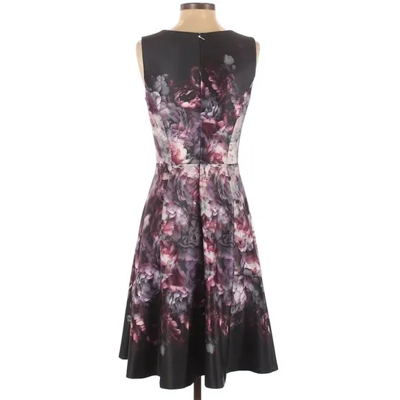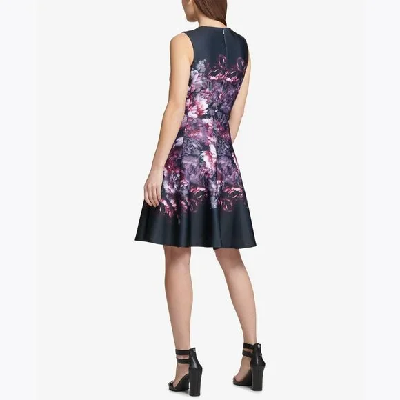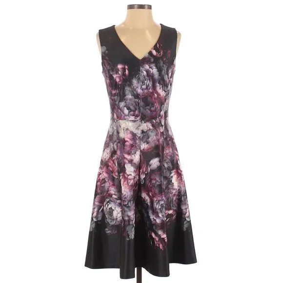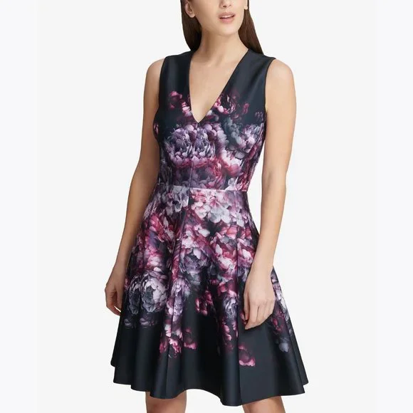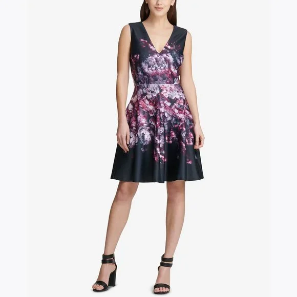 The answer to any occasion, DKNY's floral fit-and-flare dress gives you soft, feminine details with city-approved polish.V-neckline; Fit & flare silhouetteHidden back zipperUnlinedPolyester/spandexDry cleansize 4 smallapprox. measurementsbust 35waist 27length 38new with tags NWTcolor: purple | black | graydesigner: DKNYstyle no. DD8GK588smoke-free home@wickedrosevtg[C1 | I43]tags: wedding guest holiday party x-mas Christmas church service company office career wear business attire cocktail garden tea party Mother's Day Sunday Brunch cruise formal dinner date night out Broadway show balletBundle 2+ items for a discount & save on shipping!