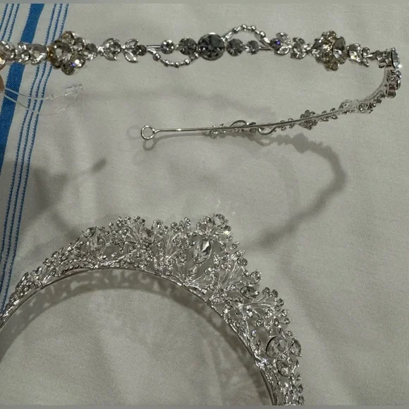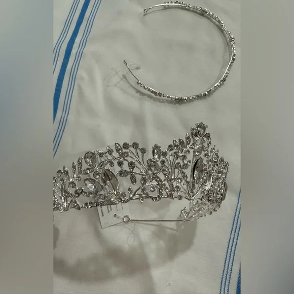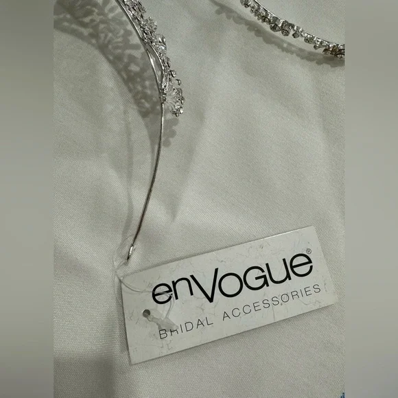 Bought both this headband and tiara from a San Francisco bridal store for $300. Selling both as I ended up not using them. Beautiful, lightweight but also expensive looking in real life. En Vogue creates a stunning collection of Bridal Headpieces to go perfectly with your wedding ensemble. You will be picture perfect and perfectly framed with a headpiece from any of their beautifully designed collections.Rhinestone Tiara - Rhodium plated rhinestone tiara. Dimensions: 5.5" W x 2" H -Has tag (see pictures).Rhinestone headband - has a plastic tag holder but no tag.Pictures don’t do these two headpieces justice!