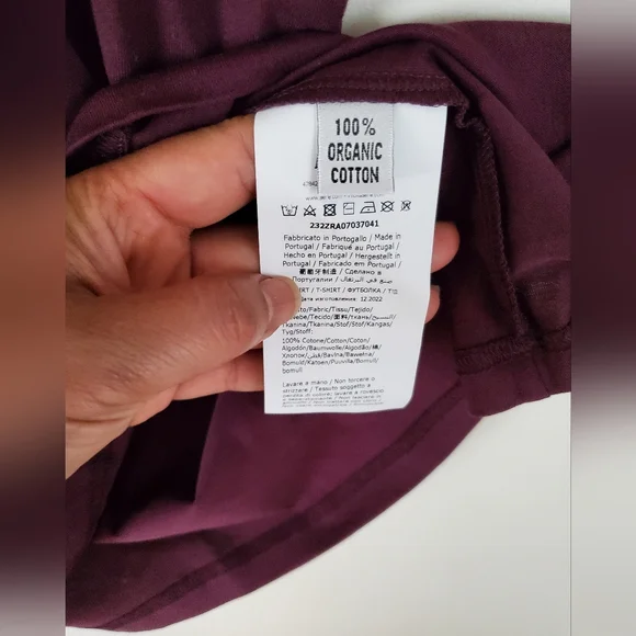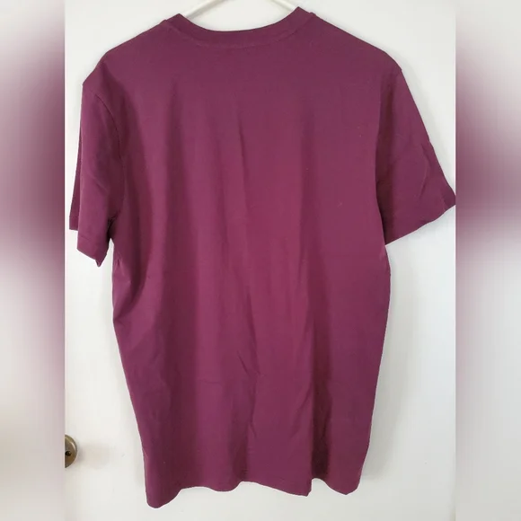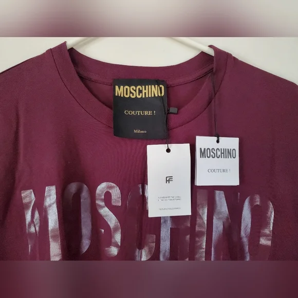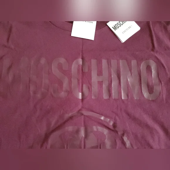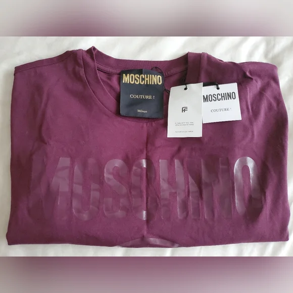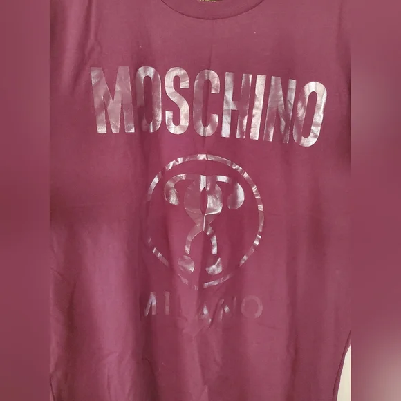 Brand New with Tags!!!Moschino Couture! Double Question mark Milano. The tag says Burgundy (it gives off kind of purple to me). No design on the back.Made of 100% Organic Cotton. Made in Italy.Size Large.Approx 21" across from pit - pit.Can be unisex.Purchased off Farfetch site but changed my mind. From a non-smoking, pet free home. Thanks for looking!