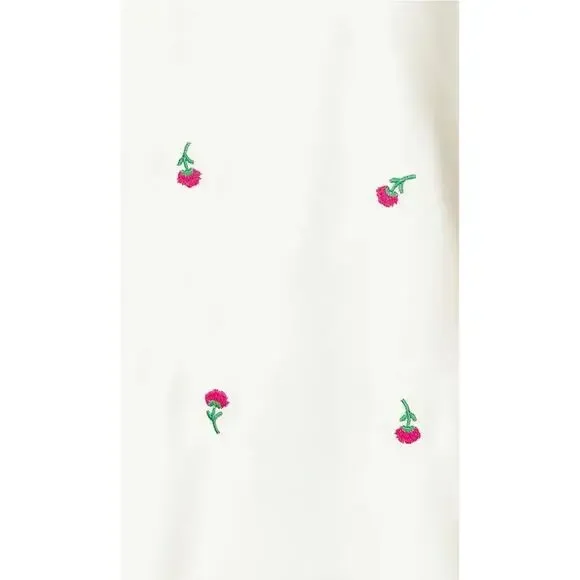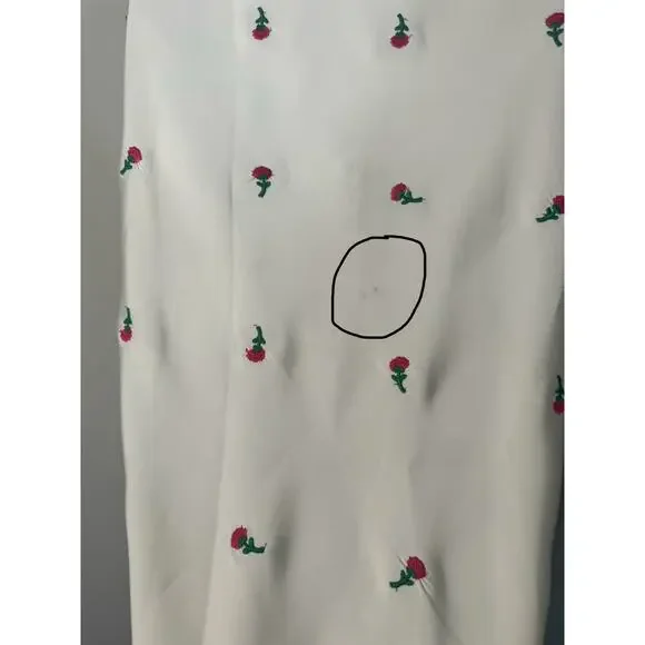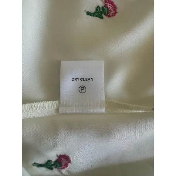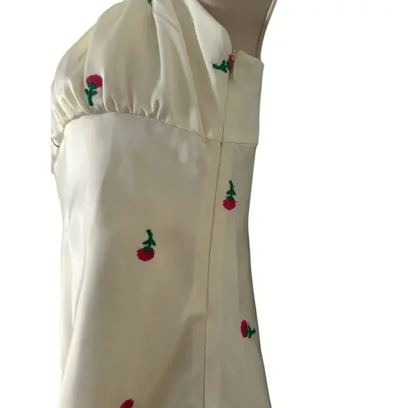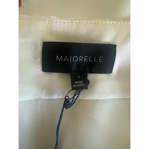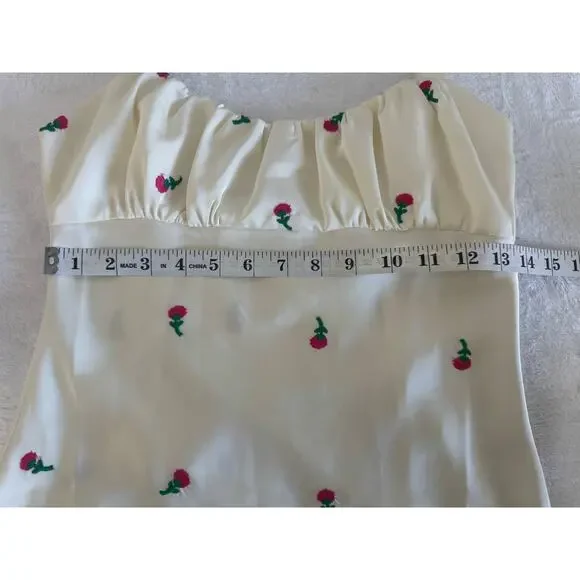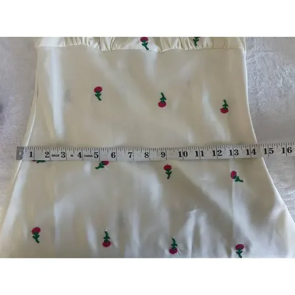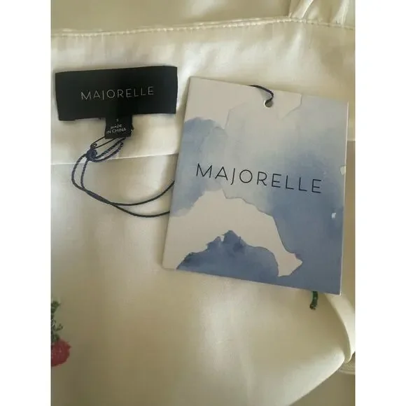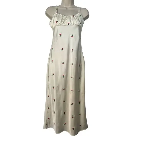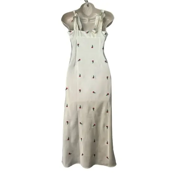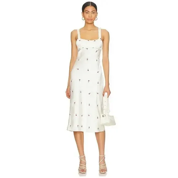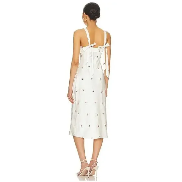 NWT MAJORELLE Eden Midi DressSize: SColor: Ivory & Pink* Satin fabric with embroidered floral detail throughout* Partially lined* Hidden side zipper closure* Self-tie shoulder straps* Self: 100% Polyester* Lining: 97% Polyester/3% Spandex* Dry clean only * Shoulder seam to hem measures approx. 45" in length* Because straps are adjustable, length may vary Sold Out On Revolve** There is a very faint dirt mark from packaging on the middle back of the dress and on the end of the left shoulder strap **tags: party, holiday, ivory, floral, ruffle, midi, date night, feminine, flirty