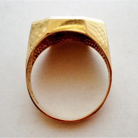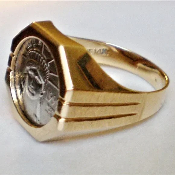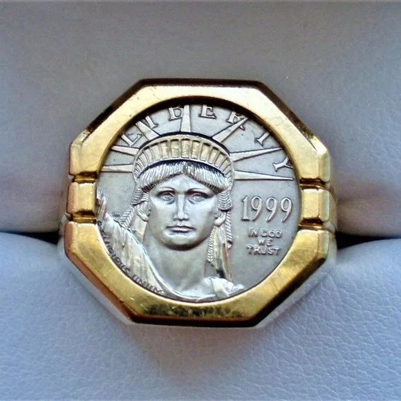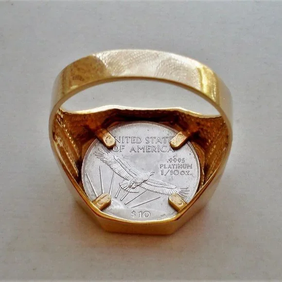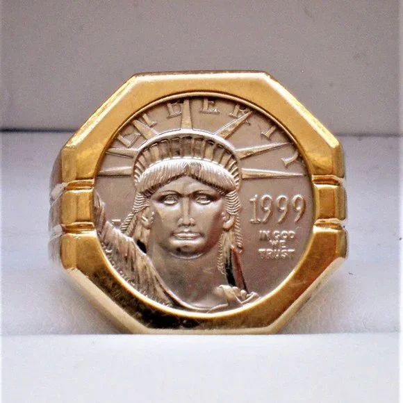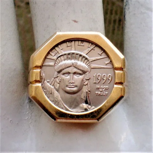 Sign up forusing my code TRAVELINGFROG to get $10 off your first purchase!Gorgeous Designer Men's Mens solid 1999 1/10 oz Platinum American Eagle Liberty Coin in solid 14K Yellow Gold setting Signet RING (marked "14K with designer mark" and acid tested). The ring is about size 11.75-12.25. Top of the ring is about 11/16" by 11/16". It weighs about 9.4 grams and is in great pre-owned condition! No damage to gold or coin.