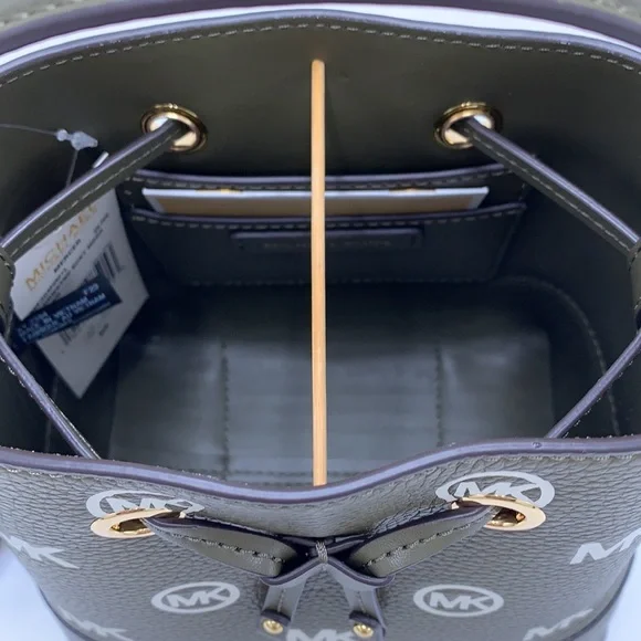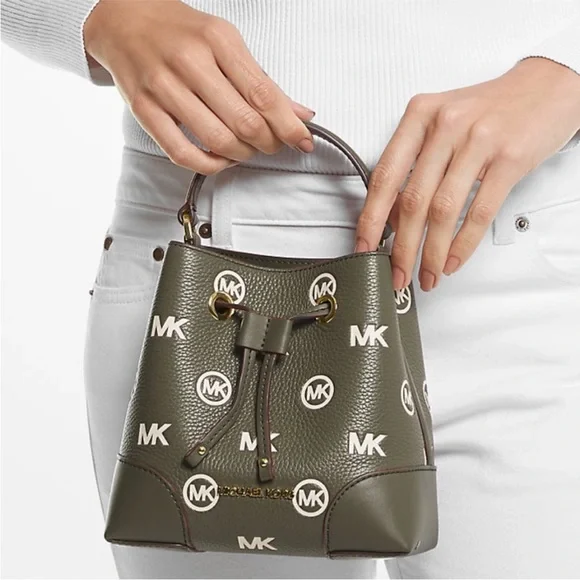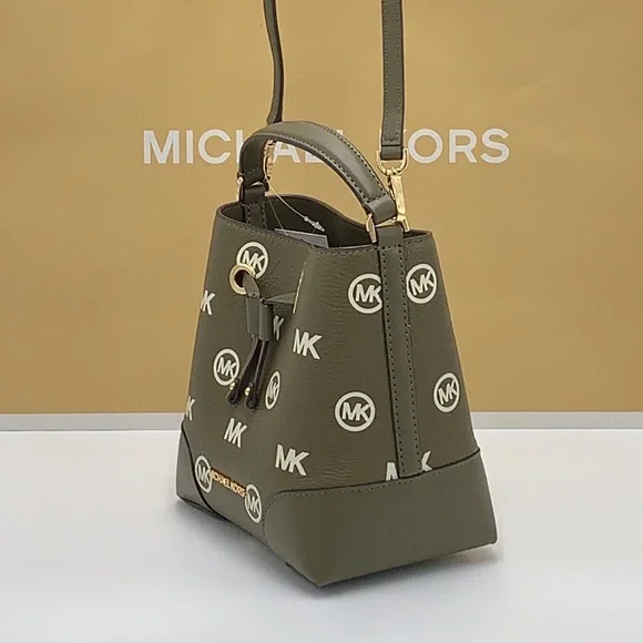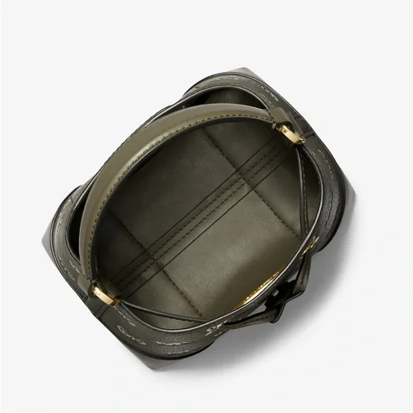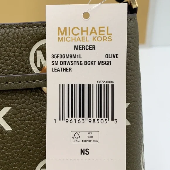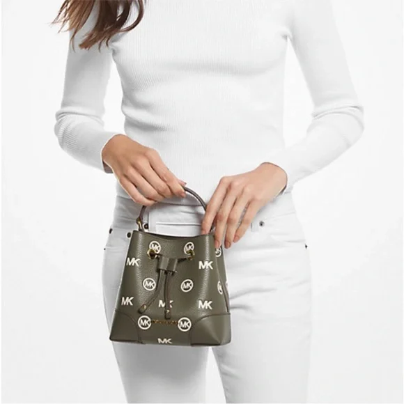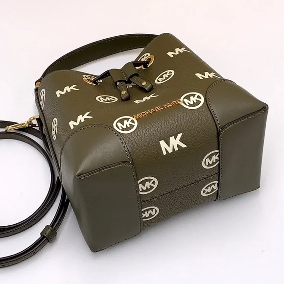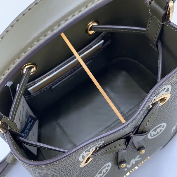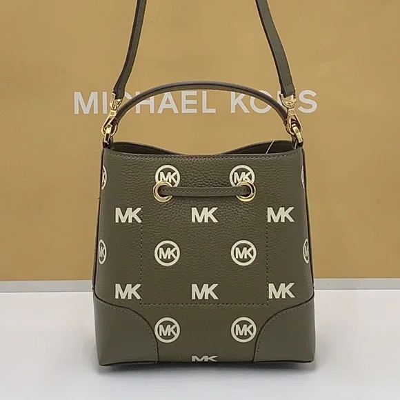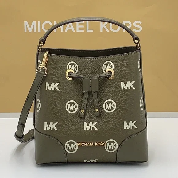 MICHAEL KORSMercer Small Logo Embossed Leather Bucket BagCOLOR OLIVENWTNew with the tag authenticThe Mercer bucket bag makes a sophisticated statement. Crafted from pebbled leather embossed with our logo charm, it features a softly structured silhouette that opens to a roomy interior with space for storing small essentials. Carry it by the top handle, or by the adjustable crossbody strap on busy days.• Bucket bag• Leather• 100% leather• Gold-tone hardware• 7'W X 7.5" H X 4.5"D• Handle drop: 3"• Adjustable measurement: 20.5"-24"• Interior details: slip