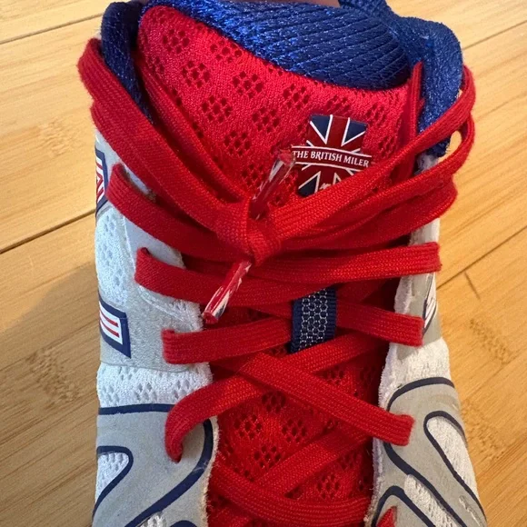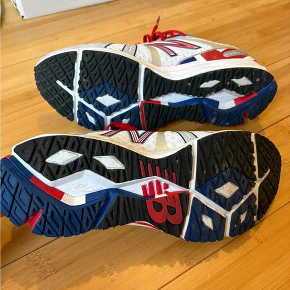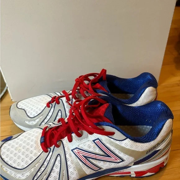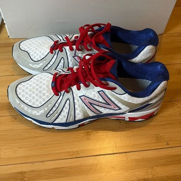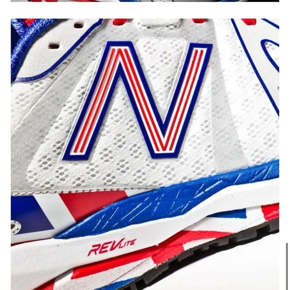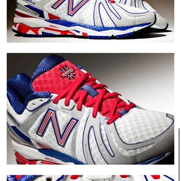 GreatconditionComfortable New Balance shoes. Blue Red and white color scheme. Ideal for sports and casual outings.limited edition version of the popular 890v2 neutral cushioning running shoe. The British Miler 890 draws design inspiration from the colours of the British flag.The new 890v2 features an 8mm drop from heel to forefoot (rather than the previous 12mm drop in the 890), putting the foot in a more natural position. With careful craftsmanship, a few changes to the detailing and grooving were made on the midsole, composed of REVlite foam, to create an even more lightweight package, without sacrificing cushioning, stability or durability.