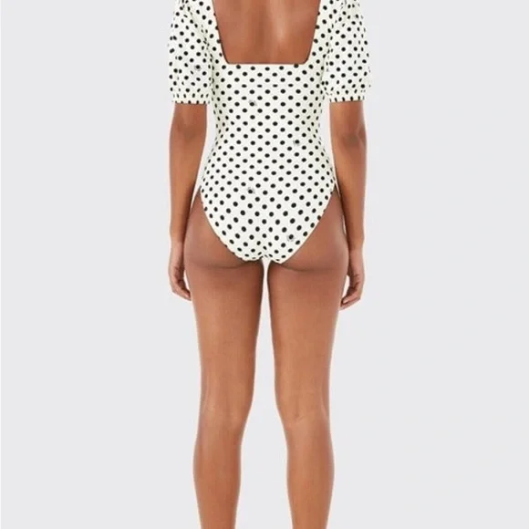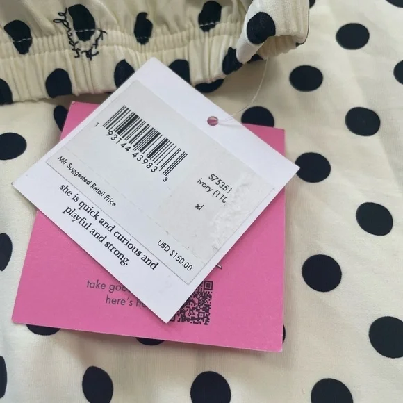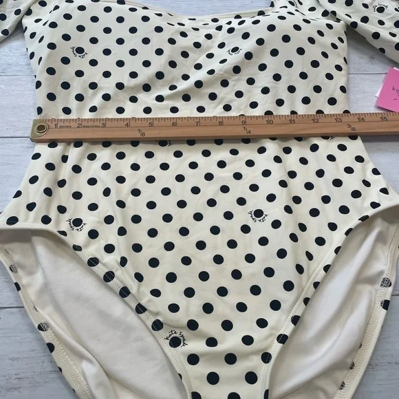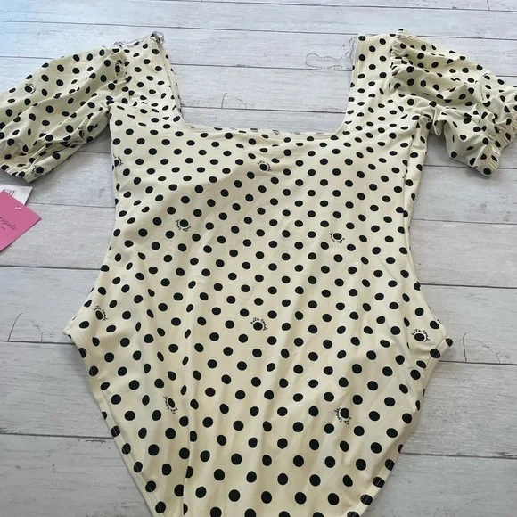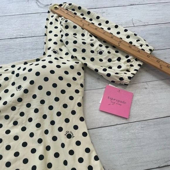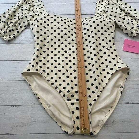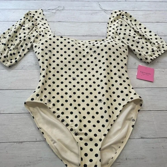NWTTHIS AUTHENTIC NWT KATESPADE SWIMSUIT RETAILS FOR $150.00 PLUS TAX IN MOST UPSCALE DEPARTMENT STORESTHIS SWIMSUIT IS KEPT IN A SMOKE AND PET FREE ENVIRONMENTkate spade new york one-piece swimsuit in playful polka dotSquare neckline enhances curvesShort puff sleeves; elastic cuffsRemovable soft cupsModerate seat coverageNylon/spandexLining: Polyester/spandexImportedModel is 5'10"/177cm.item no.00003000060000